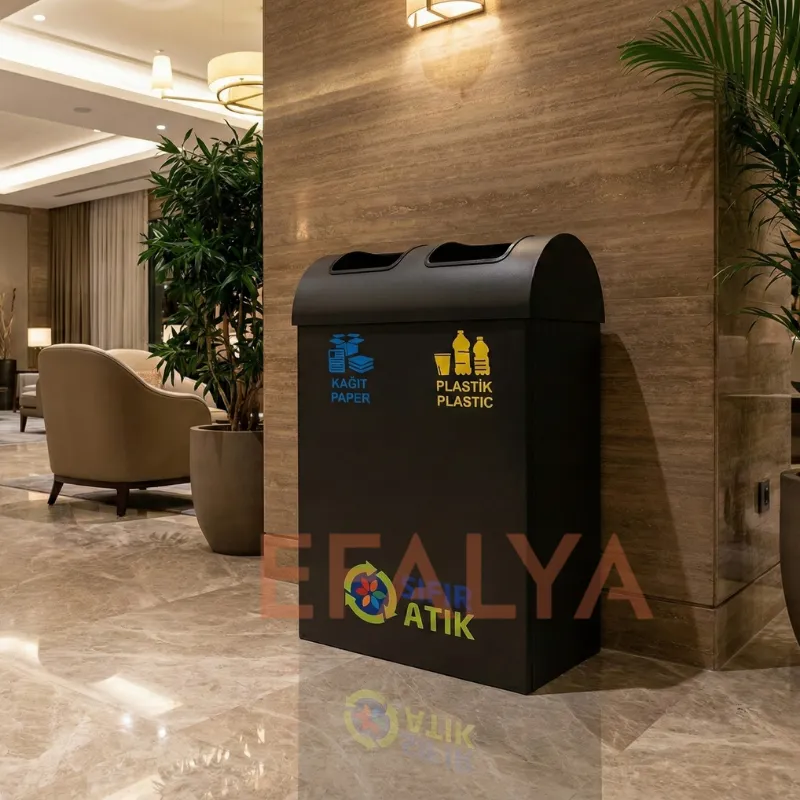 Kesinlikle. Bu model, özellikle alan kısıtlaması olan ancak atıklarını iki farklı kategoride (Örn: Çöp ve Geri Dönüşüm) ayırmak isteyen işletmeler için kompakt bir çözüm sunar. Hantal değildir, duvar kenarlarına veya asansör yanlarına yerleştirildiğinde geçiş alanını daraltmaz.