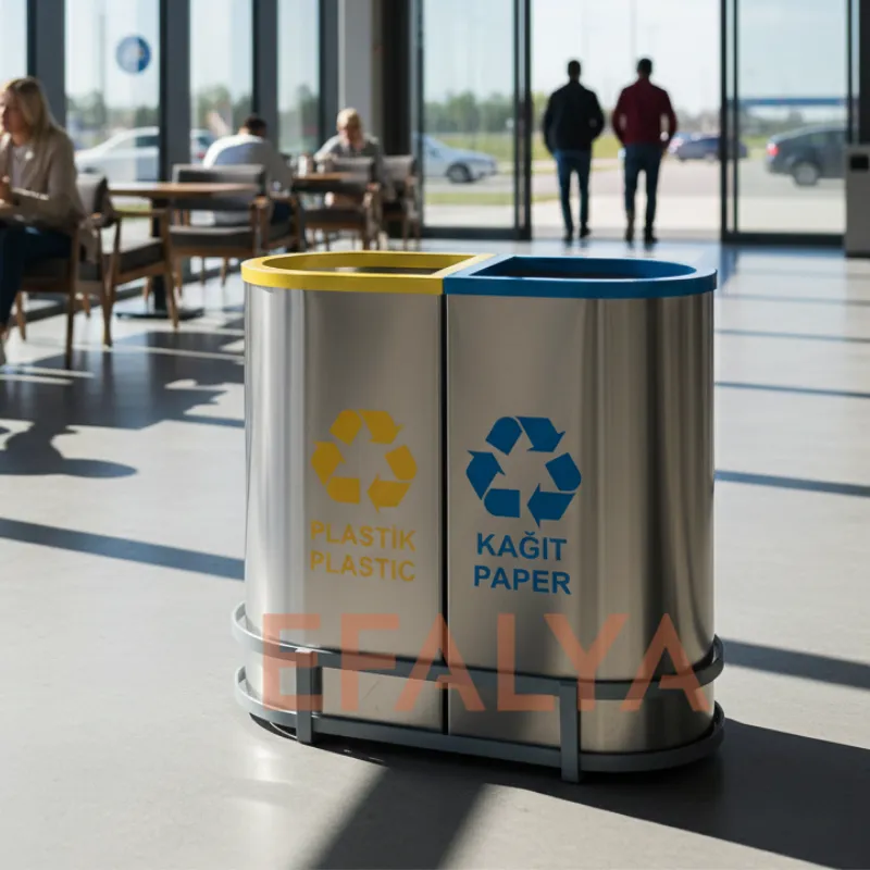 - Kusursuz Ayrıştırma: Görseldeki tasarımda da netleştiği gibi, iki ayrı bölmeli yapısıyla plastik ve kağıt atıkların kaynağında ayrıştırılması sağlanır. Bu, geri dönüşüm oranlarınızı doğrudan artırır.