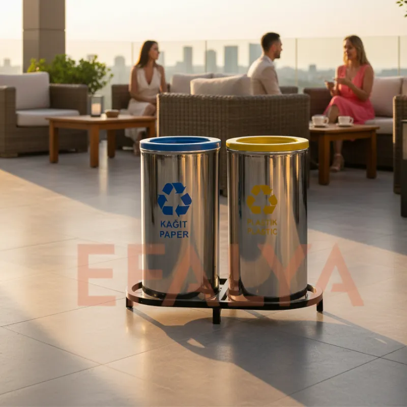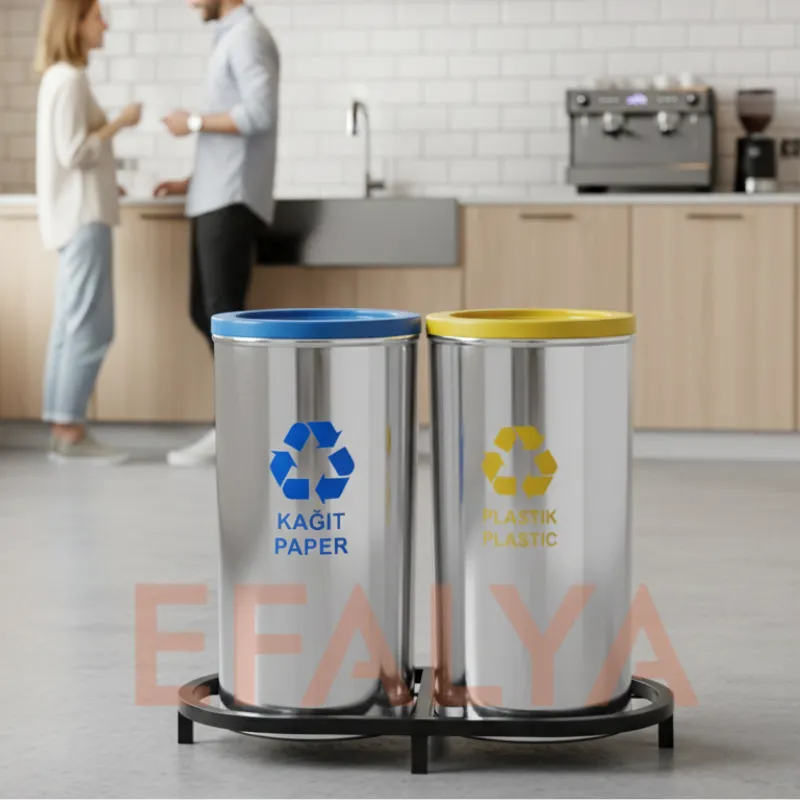 İkili setler genellikle en temel ayrıştırma olan “Geri Dönüşüm – Evsel Atık” ikilisi için tercih edilir. Ancak kontrol tamamen sizdedir. Sipariş aşamasında bu iki üniteyi “Kağıt – Plastik” veya “Metal – Cam” olarak etiketlememizi isteyebilirsiniz. Biz paslanmaz gövde üzerine, seçtiğiniz atık türüne uygun şık etiketleri uygulayıp gönderiyoruz.