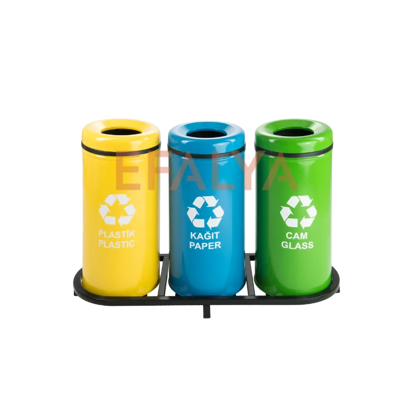 • Net Yönlendirme: Her bir kova, uluslararası standartlara uygun renk kodlaması (Sarı/Plastik, Mavi/Kağıt, Yeşil/Cam) ve net, beyaz piktogramlarla donatılmıştır. Bu, kullanıcıların atıkları doğru kovaya atmasını teşvik ederek ayrıştırma oranını maksimize eder.