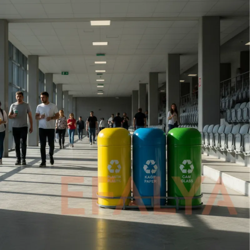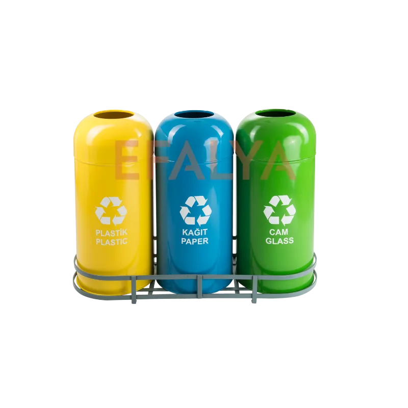 Bu 3’lü seti (Plastik, Kağıt, Cam), sağlam DKP metal gövdesi, endüstriyel lama demir konstrüksiyon standı ve modern kubbe torpil tipi kapak tasarımı ile Sıfır Atık Yönetmeliği’ne tam uyum sağlarken, dayanıklılıktan ve estetikten ödün vermez.
