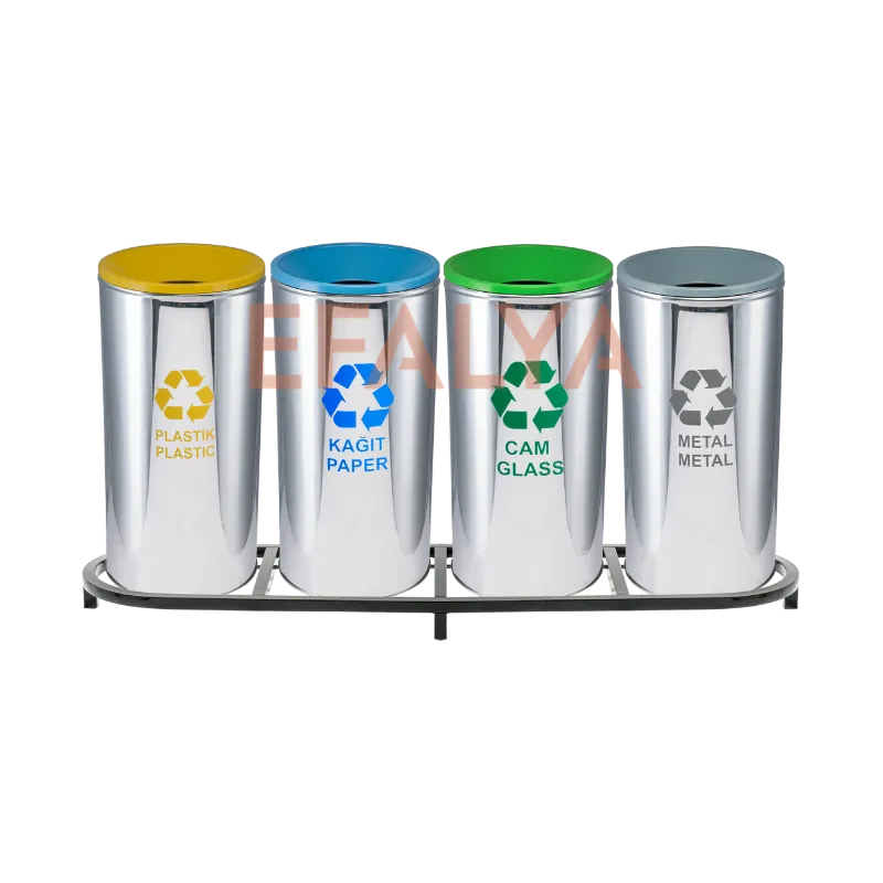 Bu set, 430 kalite parlak paslanmaz çelik gövdesi ve dört farklı renkte (sarı, mavi, yeşil, gri) elektrostatik boyalı kapağı ile atık ayrıştırma sürecini şık, anlaşılır ve hijyenik bir hale getirir. Her bir kovanın üzerinde kolayca tanınabilir piktogramlar ve açıkça belirtilmiş atık türü etiketleri (Plastik, Kağıt, Cam, Metal) yer almaktadır. Bu net ayrım, çalışanlarınızın ve misafirlerinizin ‘sıfır atık’ hedefinize kolayca uyum sağlamasını garantiler.