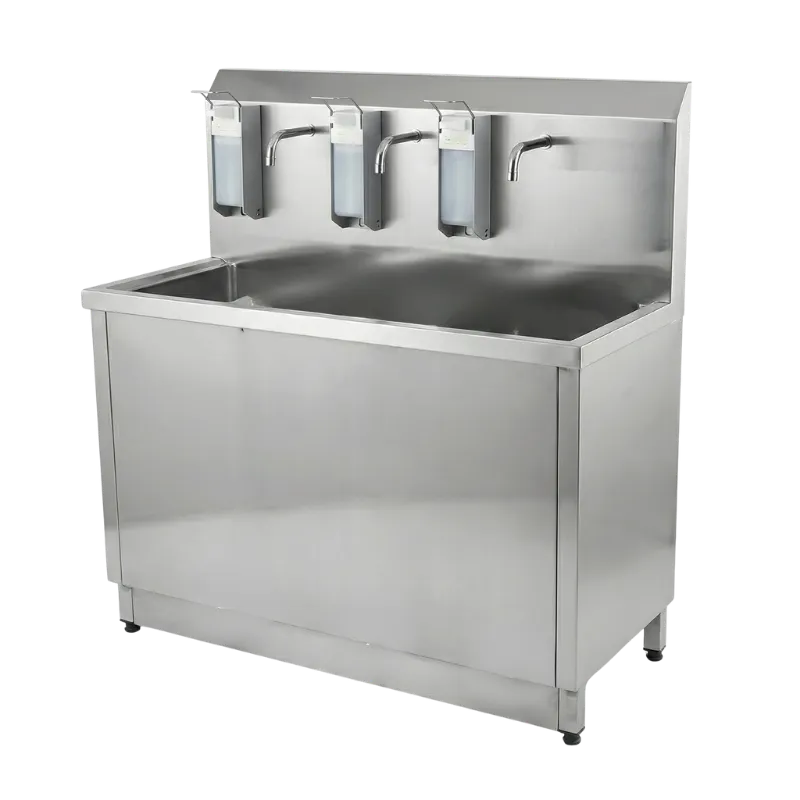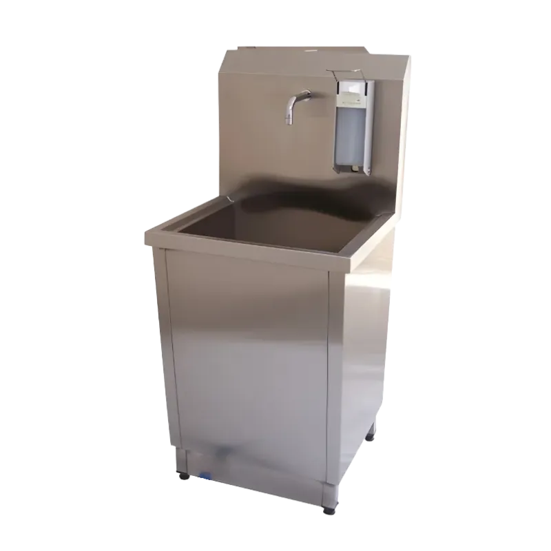 Et ve süt işleme tesislerinden unlu mamul fabrikalarına, ilaç üretim laboratuvarlarından hastane ameliyathane girişlerine kadar hijyenin tavizsiz olduğu her noktada güvenle kullanılabilir. Arka panelinde bulunan sıçratmalık (sırtlık) bölümü, duvarların su ve sabun lekelerinden korunmasını sağlarken, zemin ayakları ayarlanabilir yapıda olup, eğimli zeminlerde bile teraziye alınarak dengeli bir kurulum imkanı sunar.