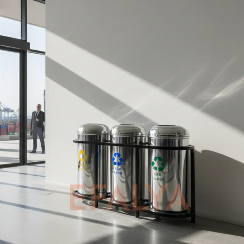 - Darbe Koruması: Stand, kovalar için adeta bir “zırh” görevi görerek, tekerlekli sandalyelerin, temizlik arabalarının, bavulların veya ağır yüklerin doğrudan kovaların hassas paslanmaz gövdesine çarpmasını engeller ve geri dönüşüm çöp kovası ünitelerinin ömrünü uzatır.