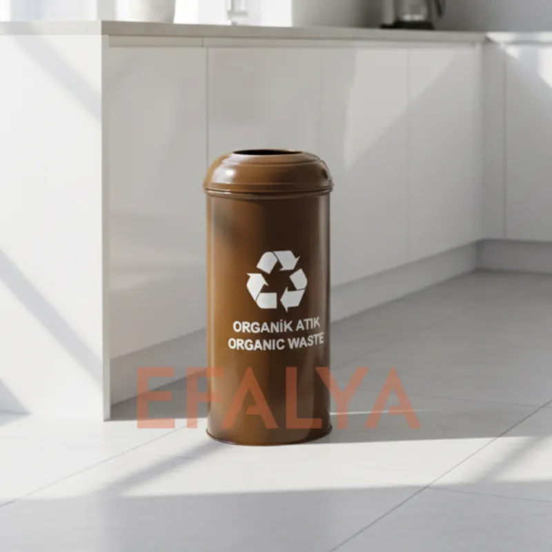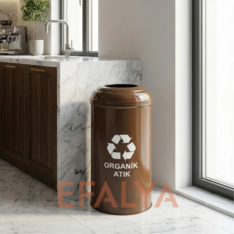 Uluslararası atık yönetimi renk kodlarına göre organik atıklar için belirlenen renk kahverengidir. Bu standartlara uygun olarak üretilen kutumuz, kullanıcıların atıklarını saniyeler içinde doğru kategoriye atmasını sağlar. Metalin sağlamlığı ile birleşen bu özel tasarım, sadece bir çöp kovası değil, aynı zamanda kurumunuzun çevre bilincini yansıtan prestijli bir ekipmandır.