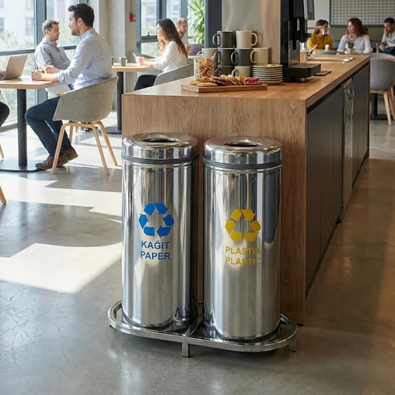 - Özel Atık Kombinasyonları: 1004C standart olarak 2’li (Görsel: Plastik/Kağıt) sunulsa da, projenizin ihtiyacına göre bu seti “Cam/Metal”, “Evsel Atık/Organik” veya “Maske/Eldiven” gibi farklı bölmelerle yeniden yapılandırabiliriz.