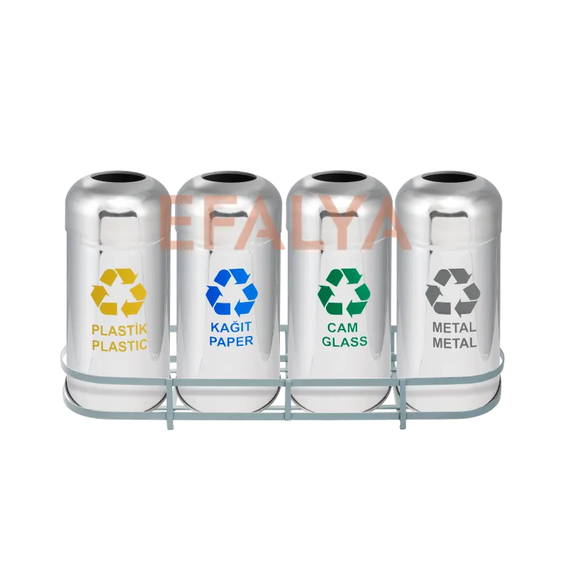 Yüksek kapasiteli 4’lü setler genellikle tam kapsamlı bir çözüm için kullanılır: “Kağıt – Plastik – Cam – Metal” veya “Geri Dönüşüm (3’lü) – Evsel Atık”. Ancak bu sıralama sabit değildir. İşletmenizin ihtiyacına göre (Örneğin 4. üniteyi “Pil Atığı” veya “Elektronik Atık” yapmak gibi) özelleştirme talep edebilirsiniz.