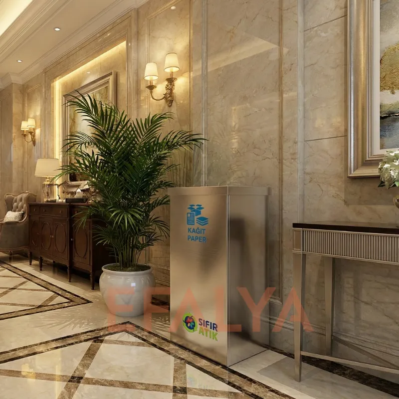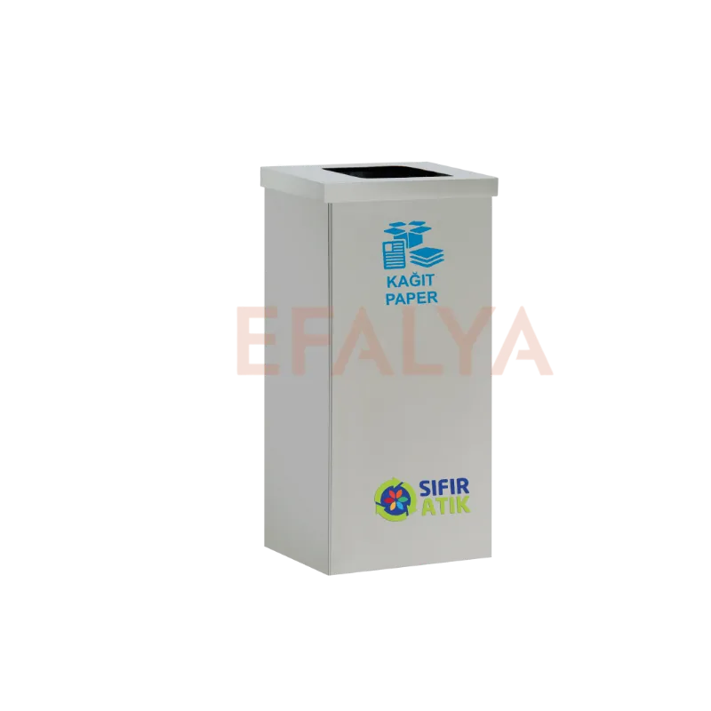 Estetik bütünlüğün altında yüksek operasyonel verimlilik yatar. Bu model, içinde kolayca boşaltılabilen galvaniz veya plastik gizli bir iç kova barındırır. Temizlik personeli, ağır dış paslanmaz gövdeyi kaldırmak yerine, sadece hafif iç kovayı çıkarıp boşaltır. Bu, operasyonel hızı artırır ve ana gövdenin kirlenmesini önler. Üst kısımdaki açık kare atış ağzı, kullanıcıların atıklarını herhangi bir kapağa dokunmadan, %100 hijyenik ve temassız bir şekilde atmasını sağlar. Gövde üzerindeki modern, minimalist piktogramlar (Kağıt/Paper) ve “SIFIR ATIK” logosu, uluslararası standartlarda net bir yönlendirme yaparak ayrıştırma verimliliğini artırır.
