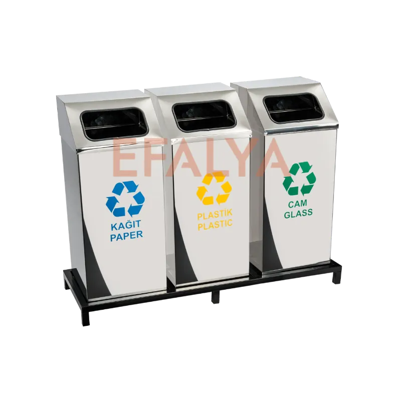 Kurumsal mekanlarda ve yüksek prestijli ticari alanlarda, atık yönetimi çözümleri operasyonel bir gereklilik olmanın ötesinde, mekanın kalitesini yansıtan bir dekorasyon unsuru haline gelmiştir. Paslanmaz Kare 3lü Sıfır Atık Seti modelimiz, bu üst segment beklentiyi karşılamak üzere tasarlanmış, 430 kalite paslanmaz çeliğin asaleti ile modern geometrik tasarımı birleştiren 3 bölmeli bir istasyondur.