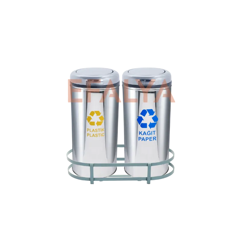 Her bir kovanın üzerinde yer alan net, renkli ve modern piktogramlar (Sarı/Plastik, Mavi/Kağıt), kullanıcıların atıkları tereddüt etmeden doğru kovaya atmasını sağlar. Kovalar, elektrostatik boyalı metal stand içerisinden bağımsız olarak kolayca boşaltılabilen bir yapıdadır, bu da temizlik personelinin bakım işlemlerini son derece hızlı yapmasına olanak tanır.