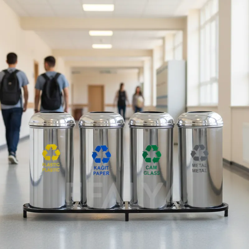 Hayır, aksine daha şık bir çözüm sunar. Renkli plastik kapaklar yerine, paslanmaz gövde üzerine uygulanan özel renkli etiketler ve görsellerle (Mavi-Kağıt, Sarı-Plastik vb.) yönlendirme yapılır. Bu sayede “rengarenk” bir görüntü yerine, metalin asaletini koruyan ama kullanıcıyı net bir şekilde yönlendiren sofistike bir istasyon elde edersiniz.