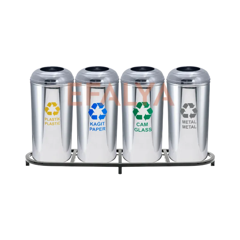 Görselde incelediğiniz gibi, bu model, hem gövdesi hem de kapakları 430 Kalite Paslanmaz Çelikten üretilmiştir, bu da ona tamamen krom görünümlü, zarafetli ve temiz bir hava katar. Ayrıştırma, renkli kapaklar yerine doğrudan paslanmaz çelik yüzeye uygulanan renkli (Sarı, Mavi, Yeşil, Gri) piktogramlar ve yazılarla sağlanır. Bu tasarım detayı, hem şık hem de fonksiyonel bir çöp kutusu arayanlar için minimalizmi ve üst düzey kaliteyi temsil eder.